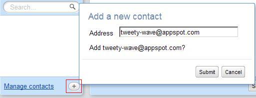 Agora clique em New Wave. Clique no símbolo + para adicionar um novo contato a esse Wave, e selecione Tweety: